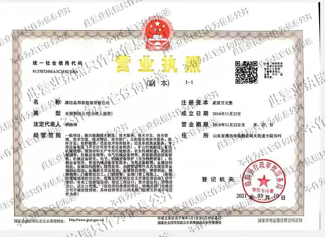 潍坊晶邦新能源有限公司是致力于从事烘干机、干燥窑、木材烘干机、中药材烘干机、转筒烘干机、高频烘干机的研究、开发、生产和销售型企业。产品涵盖木材烘干设备、木材干燥设备、木材烘干箱、木材烘干炉、木材烘干机、高频真空木材烘干机、食品烘干设备、柴电两用红木烘干箱、滚筒烘干机、单板烘干机、红木烘干设备、木材干燥机、热风蒸汽烘干炉及车间、大棚采暖设备等。产品广泛应用于木材、建材、食品、中药材、化工、烤漆、纸制品、纺织等行业的烘干,以及车间、展厅、养殖车间、花卉大棚等大空间的供暖。
